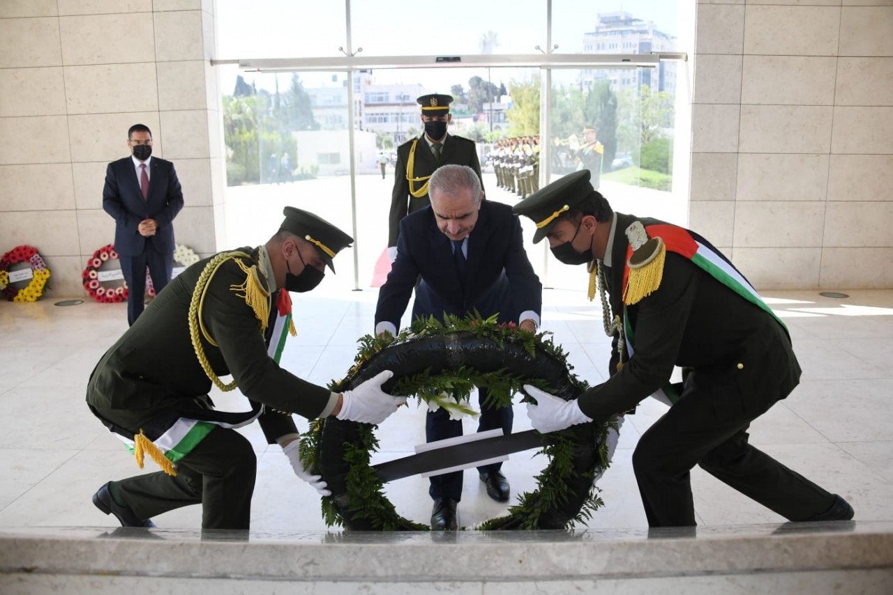 وضع رئيس الوزراء الفلسطيني الدكتور محمد اشتية، نيابة عن الرئيس محمود عباس، إكليلا من الزهور على قبر الرئيس الشهيد ياسر عرفات، اليوم الخميس برام الله، بمناسبة عيد الفطر السعيد.