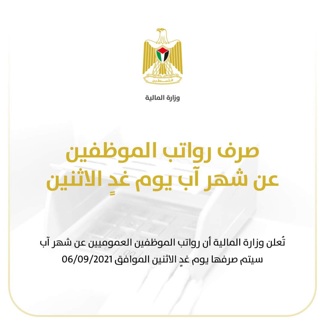 أعلنت وزارة المالية الفلسطينية، اليوم الأحد، موعد صرف رواتب الموظفين عن شهر آب