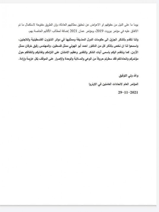 أعلن اتحادات العاملين في وكالة غوث وتشغيل اللاجئين الفلسطينيين "أونروا"، عن التوصل لاتفاق مع المفوض العام للأونروا، والذي سيتم بناء عليه تعليق الإضراب العام يوم الخميس القادم.