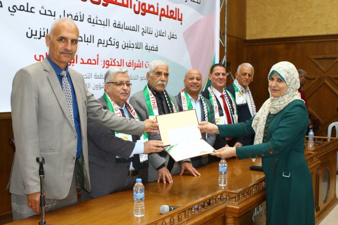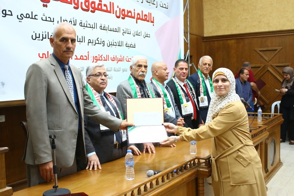 وفي ختام الحفل تم توزيع الجوائز للفائزين، وتكريم لجنة التحكيم بالإضافة الى ثلاثين باحثاً اوصت لجنة التحكيم بطباعة ابحاثهم كما تم تكريم الباحثين الذين شاركوان بأبحاثهم في المؤتمر العلمي الأول الذي عقدته دائرة شؤون اللاجئين ولجانها الشعبي في مخيمات المحافظة الوسطى تحت عنوان (قضية اللاجئين الفلسطينيين ومتطلبات الدفاع عن حق العودة).