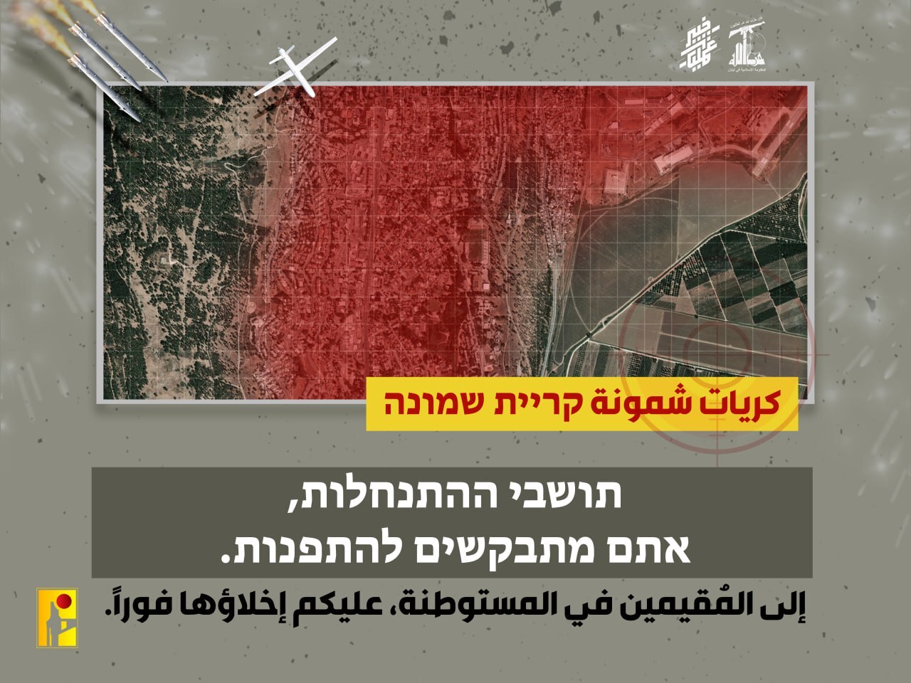 ونشر الإعلام الحربي في "حزب الله" مقطع فيديو يذكر فيه أسماء المستوطنات المطالب سكانها بإخلائها معلقا على الموضوع بالقول: "إلى كل المقيمين في المستوطنات المذكورة في هذا البيان. يطلب إليكم الإخلاء فورا. مستوطناتكم تحولت إلى مكان لانتشار واستقرار قوات العدو العسكرية التي تهاجم لبنان. بفعل ذلك، أصبحت أهدافا عسكرية مشروعة للقوة الجوية والصاروخية في المقاومة الإسلامية".