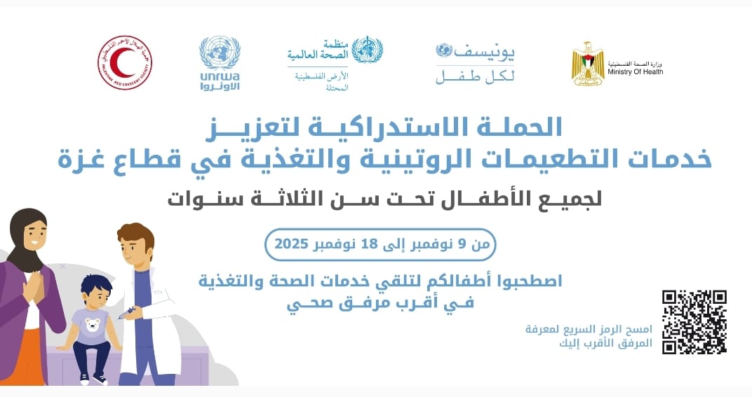 تنطلق غداً الأحد الموافق 9 نوفمبر 2025 الحملة الاستدراكية لتعزيز خدمات التطعيمات الروتينية والتغذية للأطفال دون سن الثلاث سنوات، والتي تستمر حتى 18 نوفمبر، بمشاركة طواقم من جمعية الهلال الأحمر الفلسطيني في عدد من عياداتها ونقاطها الطبية المنتشرة في محافظات قطاع غزة.