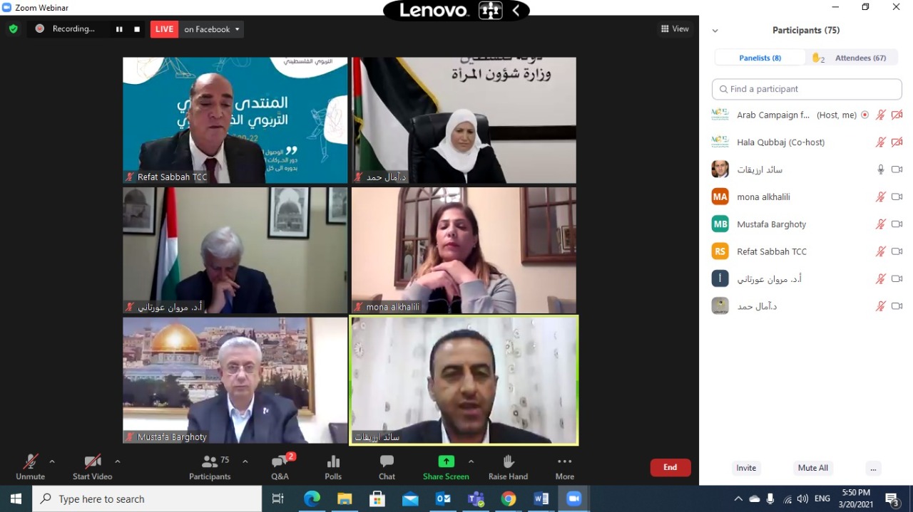 شارك وزير التربية والتعليم أ.د. مروان عورتاني، في افتتاح فعاليات المنتدى النسوي التربوي الفلسطيني، الذي انطلقت فعالياته اليوم افتراضياً؛ بحضور شخصيات وزارية واعتبارية وناشطات نسويات وأكاديميين ومؤثرين وممثلين عن مؤسسات أهلية ومجتمعية.